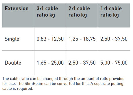 7 weights at 5kg, plus the start weight at 5kg are elegantly housed in each SlimBeam. The individual cable ratio (standard 3:1) permits various grades of weight.