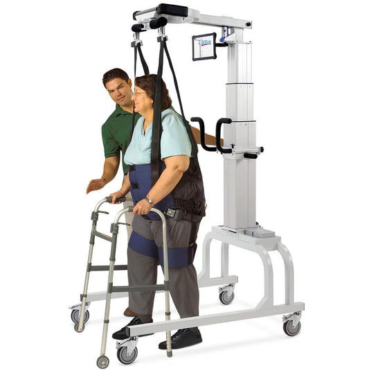 LiteGait provides proper posture, reduces weight bearing, eliminates concerns for balance, and facilitates the training of coordinated lower extremity movement. Its unique harness design not only permits unilateral or bilateral support, allowing progression of the weight-bearing load from non to full weight bearing, but also allows the clinician to manually assist the legs and pelvis to achieve proper gait patterns. The LiteGait harness provides frontal, sagittal and transverse plane postural control.