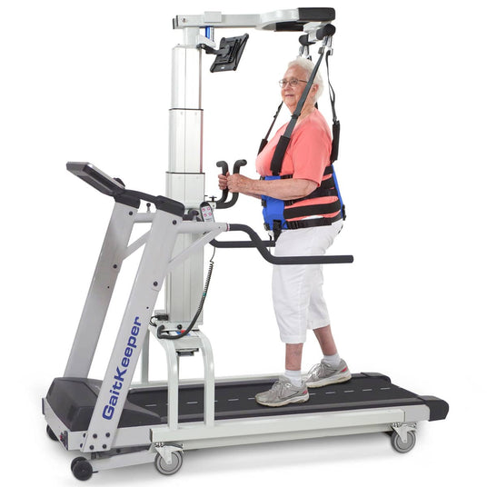 The LiteGait GaitKeeper’s innovative features make it easier for either the clinician or the patient to control the treadmill. You can expand your treatment options with the wide 22″ walking surface, powerful AC motor, starting speeds of 0.2kph, and Adjustabar Handrails.