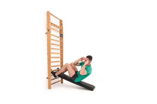 The inclined bench can be hung on any rung (max. height 95 cm) and therefore at different angles. It serves as a training bench or as a backrest. After training, it can be hung on a rung to save space.