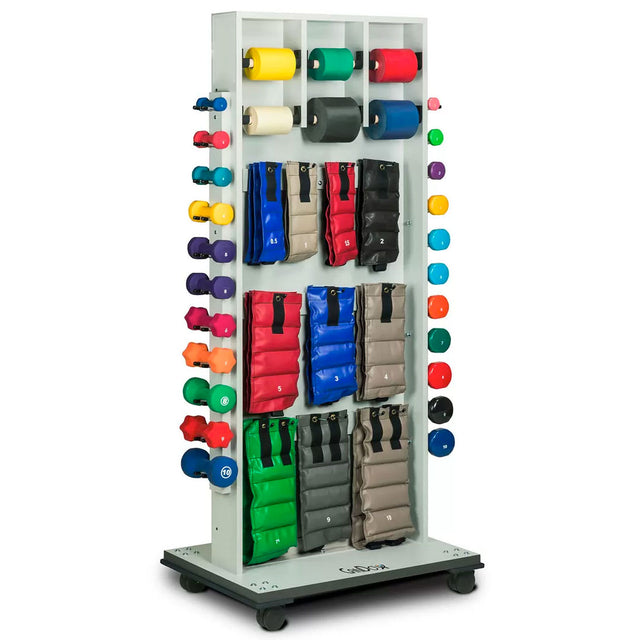 The TheraKit Mobile Treatment Storage Rack with Mirror combines functionality and convenience. It features a full-length mirror, making it ideal for physical therapy settings, allowing both practitioners and patients to monitor posture and movements while storing therapy equipment.