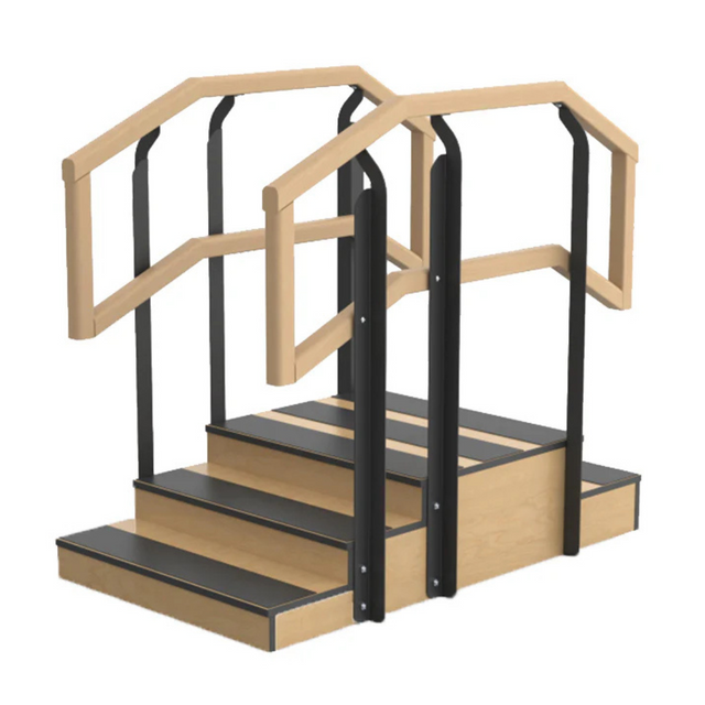 3-up, 2-over timber stairs with dual handrails and reinforced base for safe, stable rehab and mobility training.