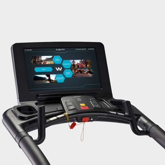A premium treadmill featuring a 21" interactive touchscreen for advanced performance tracking and immersive workouts.