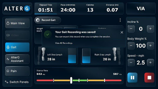 AlterG’s Stride Smart Gait Analytics delivers real-time insights into key metrics like step length, stance time, and weight symmetry—helping clinicians objectively track progress, adjust treatment plans, and improve outcomes with every session.