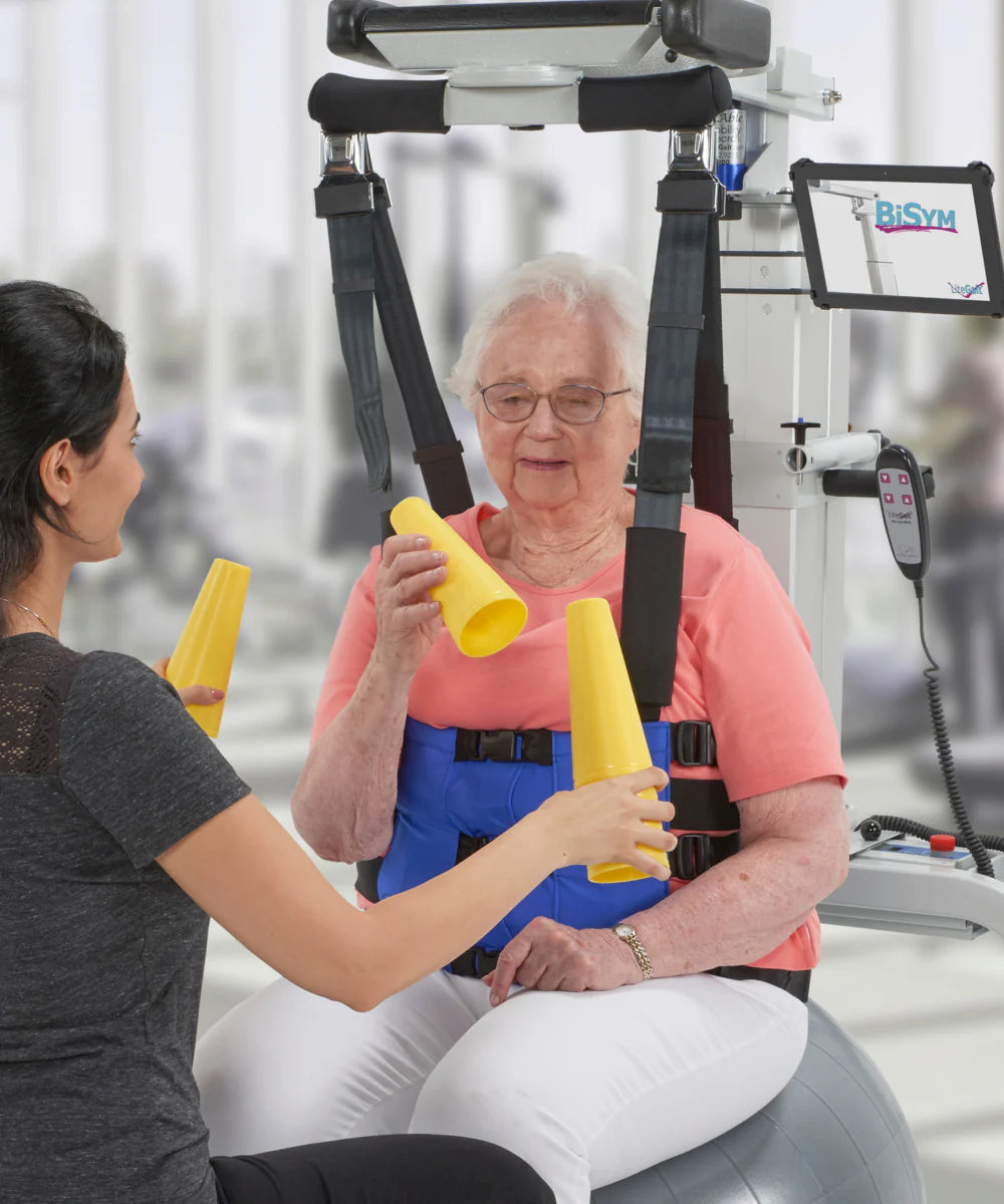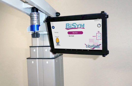 Introducing the Tablet BiSym for LiteGait, a system that measures unilateral or bilateral support. With LiteGait's two-armed yoke, the harness adjusts support on each side as needed. Sensors monitor weight-bearing shifts during the gait cycle, and the BiSym display shows support in weight units or as a percentage of body weight. A simple toggle allows these real-time measurements to be used as patient biofeedback.